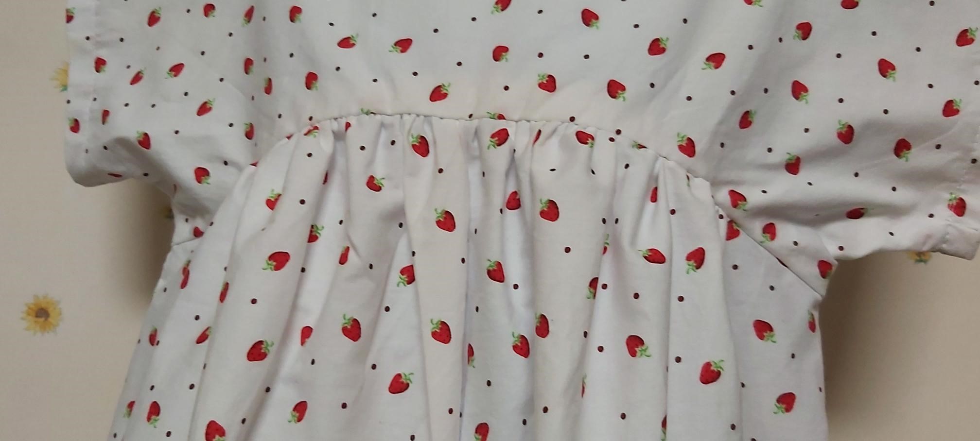 Robe fille manches courtes fermée par un bouton au dos. Empiècement arrondi et ensemble de plis pour le bas ou fronces donnant un jolie volume.